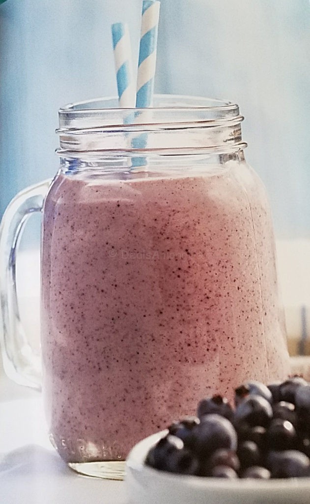 One of my favorite recipes is the Blueberry Muffin Smoothie which includes blueberries, bananas, Greek yogurt, large rolled oats, flax seeds, lemon juice, pure vanilla extract and unsweetened almond milk. The recipe is as simple and place all the items in the blender and blend for 30 seconds.