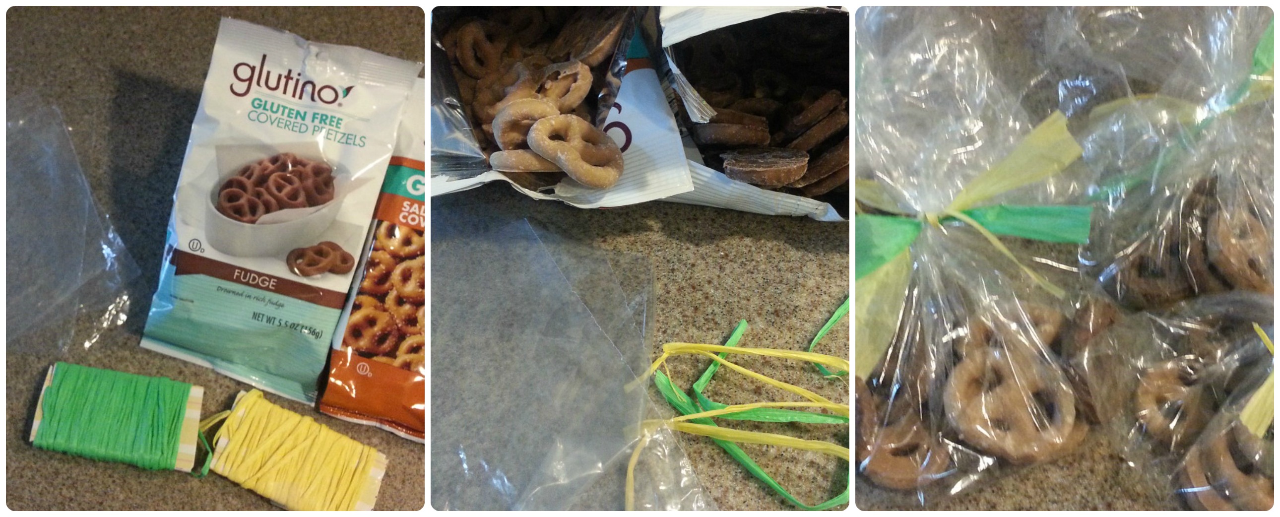 How To: I opened each bag and counted out 5 of each flavor. I took 4 plastic bags and cut 4 green and 4 yellow raffia into 5 inch sections. I placed 5 pretzels of each flavor in the bag and the tied the bag with one green and one yellow tie. I chose to place my completed bags into the freezer for a cool easy treat to take on road trips.