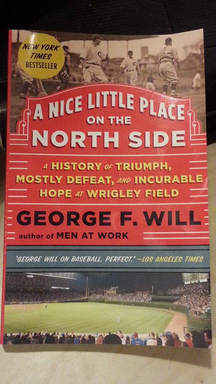 When I had the chance almost 19 years later to read George F. Wills new book A Nice Little Place on the North Side, I wanted to learn more about this institution in Chicago. According to the subtitle, this book is “a history of triumph, mostly defeat, and incurable hope at Wrigley Field” and this is an accurate description of the books contents. This New York Times Bestseller covers the 100 plus year history of Wrigley Field and of the Cubs in Chicago. This book has many stories about the Cubs and the many possible reasons for the lack of wins. The Cubs have not had the most winningest record in history, rather the opposite spanning a 105 year streak with no World Series wins and despite this they have sold out games more often than not.
