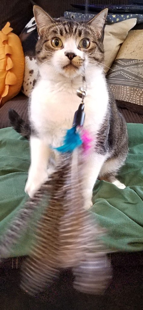 “What is your cats favorite activity?” Well, we should use the cat toys more often than we do. But when we do, we need to not let it go on for too long–the cat gets tuckered out and, I think, a bit queasy from all of her jumping and running and playing.