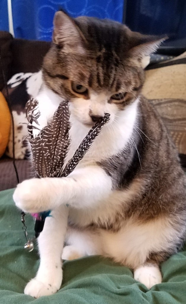 When we adopted Maggee we purchased a bunch of toys and items we thought she might like. We purchased tiny stuffed mice that got lost far to quickly, we purchased balls with bells that were inevitably stepped on and we bought a bird feathers on a string. Since she was a bit older upon adoption, but still very young and recently had given birth we were told to keep her calm the first 5 days at home – Yea! You try to keep a 9 month old kitten “calm”.