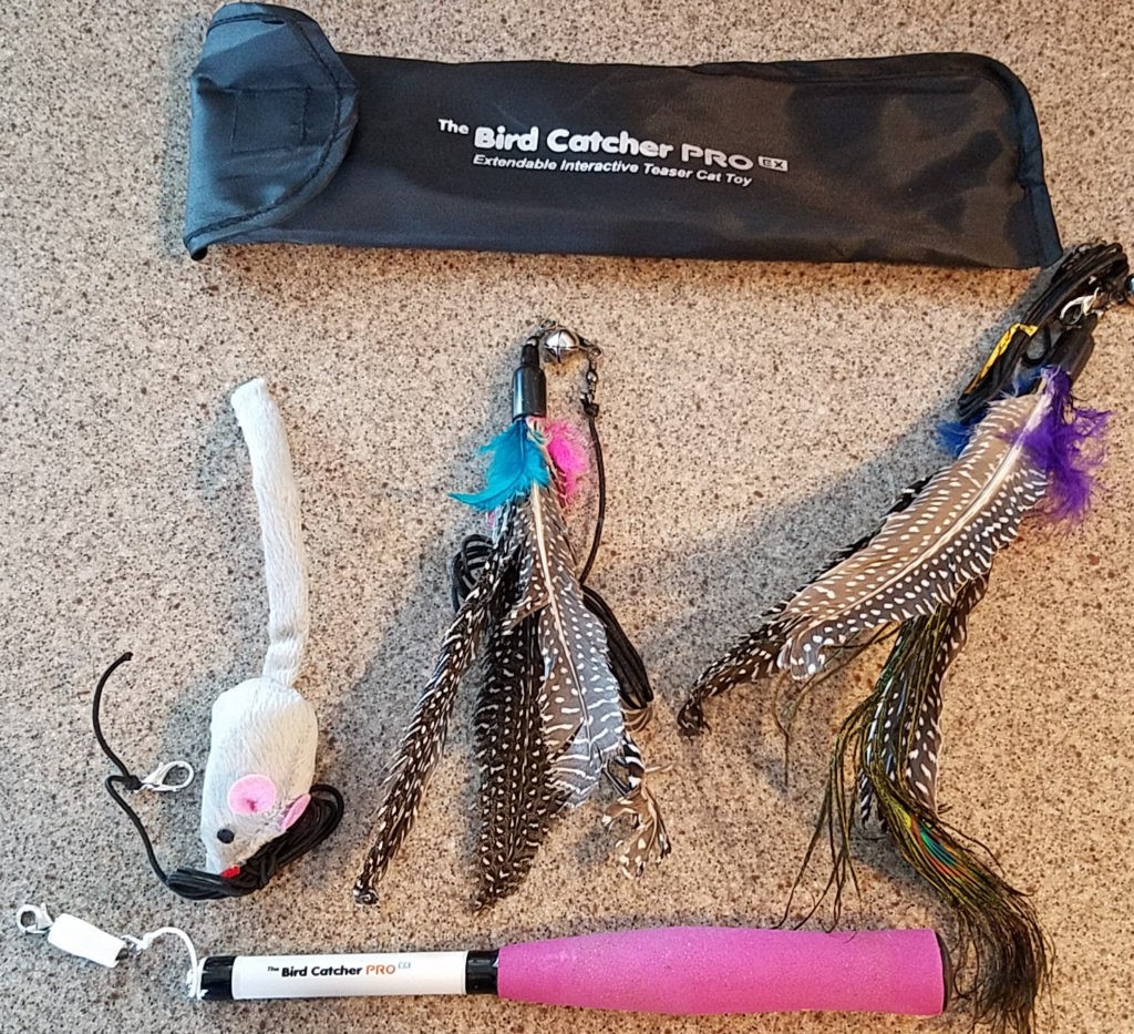 One of her favorite toys is the bird toys that seem to be flying in the air. The biggest problem is that generally these have long handles and long strings, which makes storage difficult when you live in a small house. When I saw a review of The Bird Catcher PRO Ex online, I was curious if it would be the toy she loved without the storage issues.