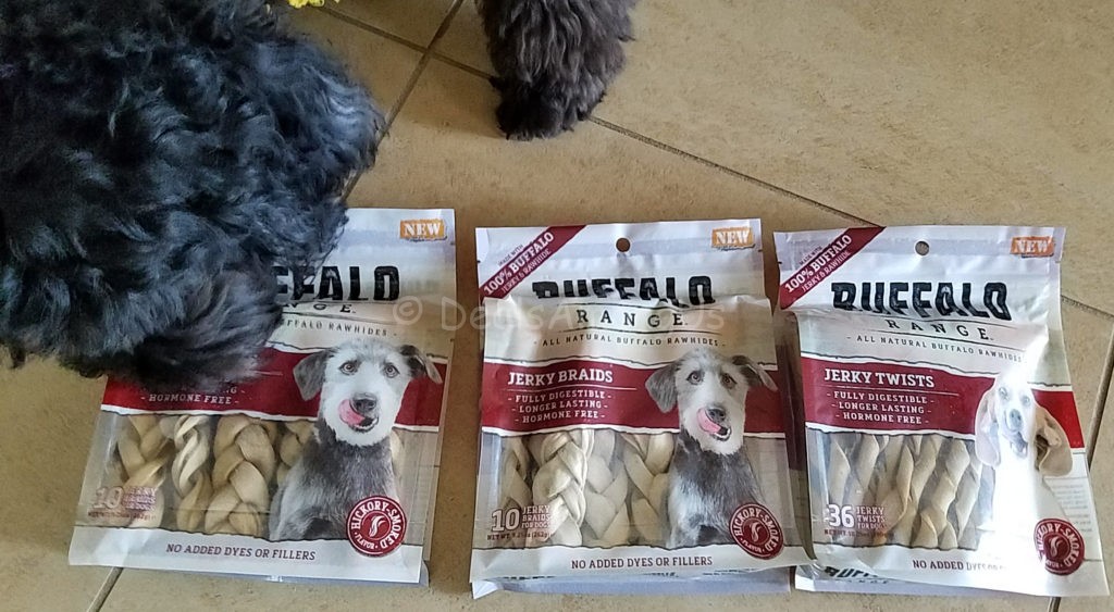 I received an assortment of Buffalo Range All Natural Buffalo Rawhide Treats including Jerky Twists, Jerky Braids and Jerky Bones for Meadow to sample and enjoy.