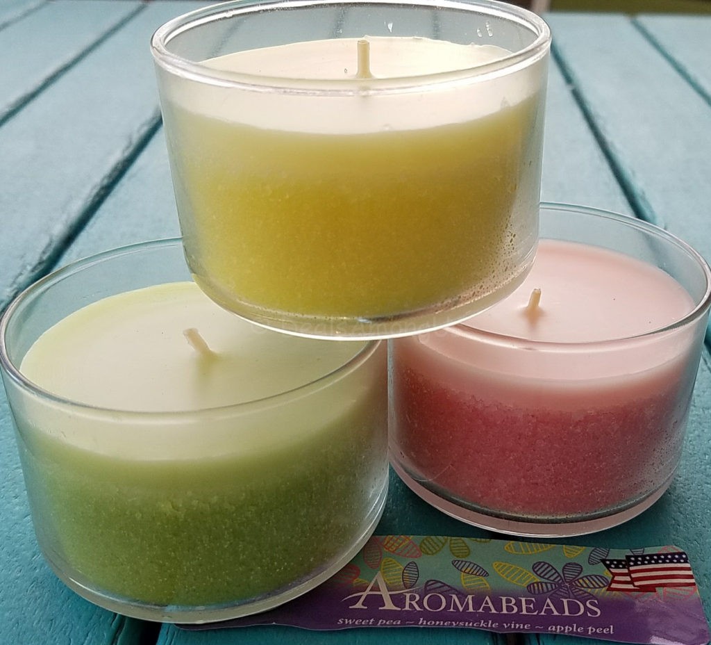 In my last order from Candlemart, I ordered the Aroma Beads so when I saw a 3 Aroma Bead Spring Mini-Candle Collection that has Sweet Pea, Honeysuckle Vine and Apple Peel fragrances. These have a 15 hour burn time and each smell so good!