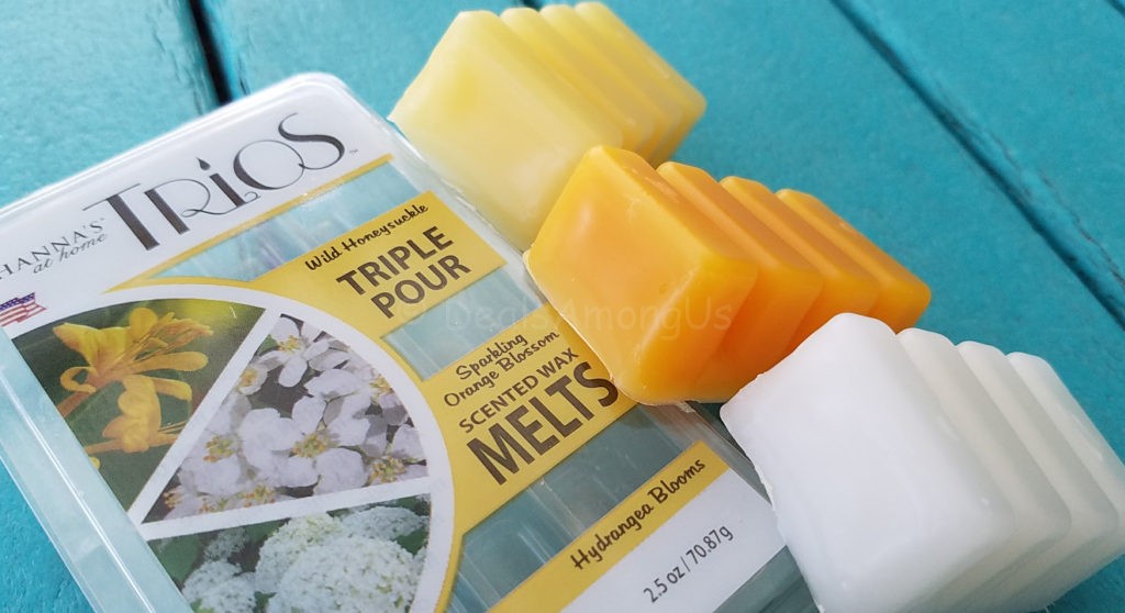 The next melts that I melted were the ones I was most eager to melt being that they are 3 different scents in each 2.5oz package. These Trios Triple Pour Wild Honeysuckle Melts included 4 Wild Honeysuckle melt cubes, 4 Sparkling Orange Blossom melt cubes, and 4 Hydrangea Blooms.