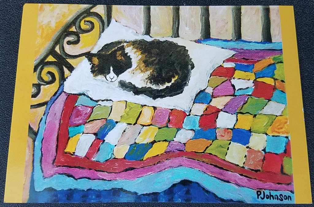 Cat Lady Featured Artist – Peggy Johnson “everygoodcolor”: When I saw this months postcard I was struck by the amount of color. Since my cats love pillows, this postcard made me smile. This will be put on my wall and added to my Cat Lady Postcard collection.