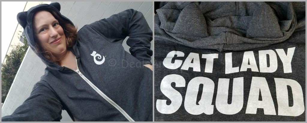 Cat Ears Hoodie – Cat Lady Squad – CatLadyBox Exclusive: This might be my favorite item I have ever received and it might get worn all the time. I loved the cat ears on the hoodie and I love that it is lightweight enough to wear over items. I got an extra-large and the fit was not overly baggy yet still gave me room to move.