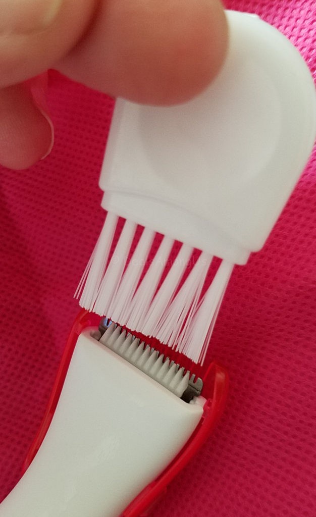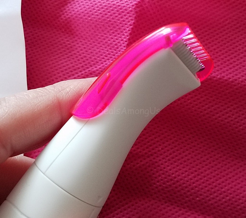 The first thing I noticed was how easy this trimmer stored, and it came with a pink travel bag, trimming guide, mini-blade attachment, foil shaver attachment and instructions. The Clio Palmperfect Wet & Dry Women’s Electric Bikini Trimmer operates on one ‘AA’ battery which is included.