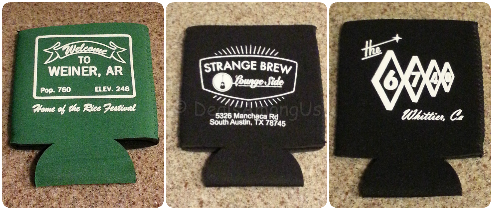 I was also sent a couple of past koozies, and like I said earlier my favorite part was discovering the locations and what their story was. I received three koozies and they originated from the following locations: First, “Welcome to Weiner, AR” – which is a small town that is not only the home of the Rice Festival but boasts a booming population of 760 people. Secondly, “Strange Brew: Lounge Side in South Austin, TX” – a music and coffee venue in Austin, TX. Featuring a rotating lineup of bands and singers which allows for a new experience each time. Thirdly, “the 6740 in Whittier, CA” – opened in July of 1997 and everything contained within the 4 walls are homemade providing a personal touch to the entire bar.