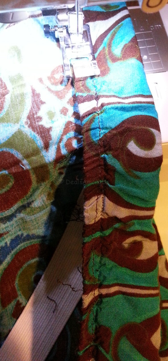 New casing for elasticAfter I removed the halter I needed a new elastic waist, so I folded the existing hem over about 1.75 inches and created a casing for my new elastic (I used “no fold 1/2 inch elastic”). This was simple, and I think the easiest way to accomplish a new waist.