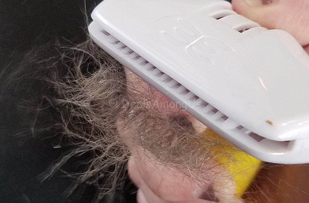 The Eazee Deshedding Brush has no sharp edges, which is a nice concern not to have since Maggee and Murfee love to “scent” items. It is in the human and pets best interest to be brushed often, as it keeps the coat shiny and keeps random fur at a minimum.