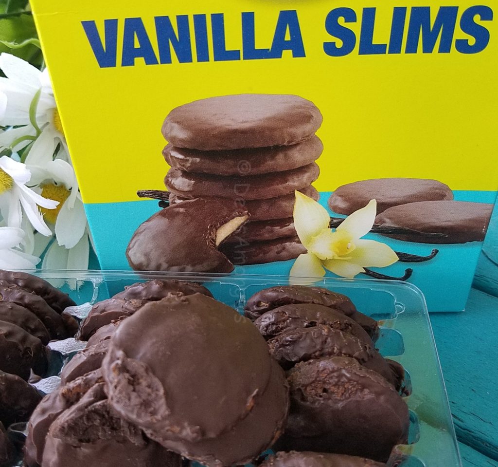 The Vanilla Slims are vanilla cookies that are described as dressed up in dark chocolate coating. These are similar to the Mint Slims and are crunchy, full of vanilla and most importantly chocolate coated!