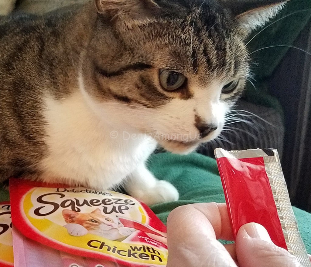 Now there are numerous things she has began to love, and spending time bonding with her humans is high on her list, as is food. If I can combine the two, she is in cat heaven. When we recently received the Hartz: Delectables SqueezeUp Cat Treats I knew that I could use it as a bonding opportunity with a treat.