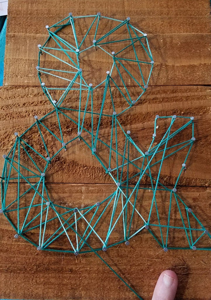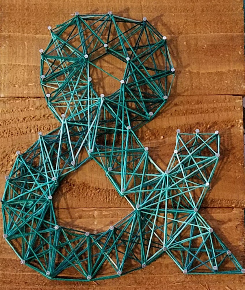 As I began to wrap the ampersand, I realized that this would take me a bit more time to fill in to my satisfaction. There was a variegated green string included in my box, which I found worked really nicely and gave a wonderful coloring. I have always wanted to try to do a string art project, and this was the perfect toe dip into this new craft.