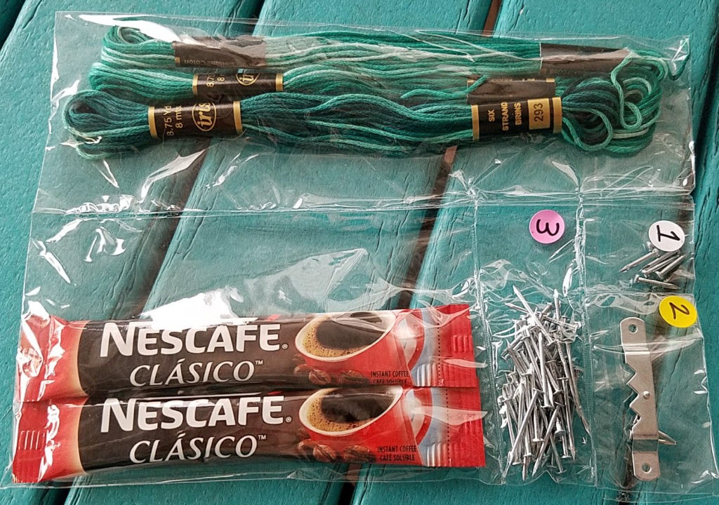 Included in the DIY String Art Kit were (3) Wood Planks, (1) Paint Brush, (2) Instant Coffee Packets, (1) Saw Tooth Hanger with nails, (6) 13mm Mini Nails, (2) 9″ Paint Sticks, (55-60) Wire Nails and (3) Skeins of Embroidery Floss. Also needed but not included was Scissors, (1) Small bowl (for the instant coffee stain) and a Hammer.
