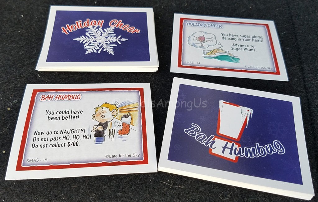 The typical “Chance” and “Community Chest” are replaced with a “Holiday Cheer” and “Bah-Humbug” of which have a holiday themed themed benefits or hurdles.