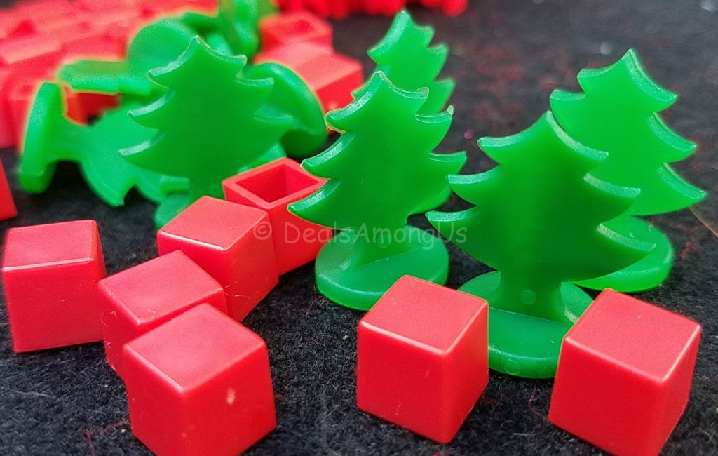 The details are what I have come to expect from Late in the Sky games and the property piece is a tree and the “hotel” is a present.