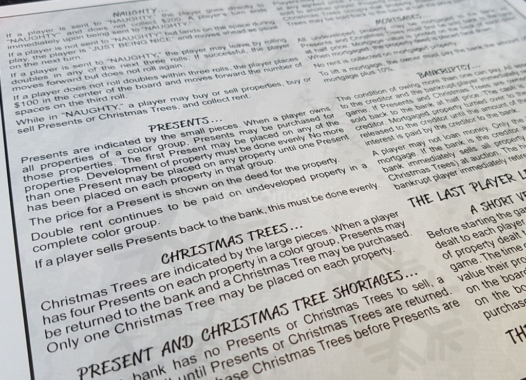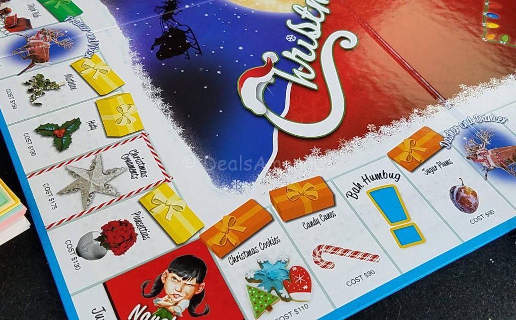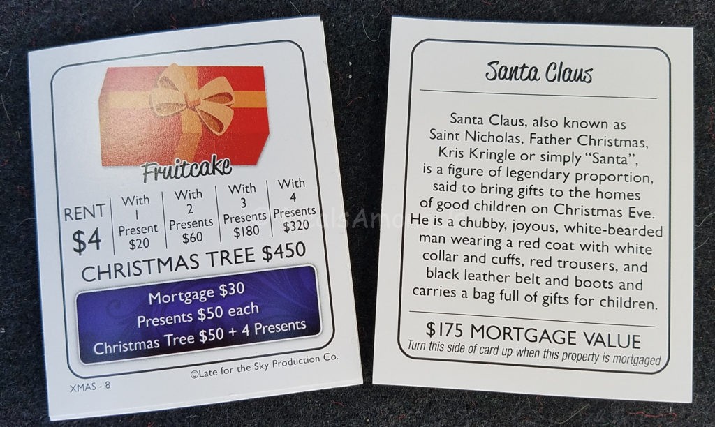 Each property is replaced with a different Christmas themed topic and the values include each step of financial increase and the back of each deed contains fun facts about the Christmas item that is featured.