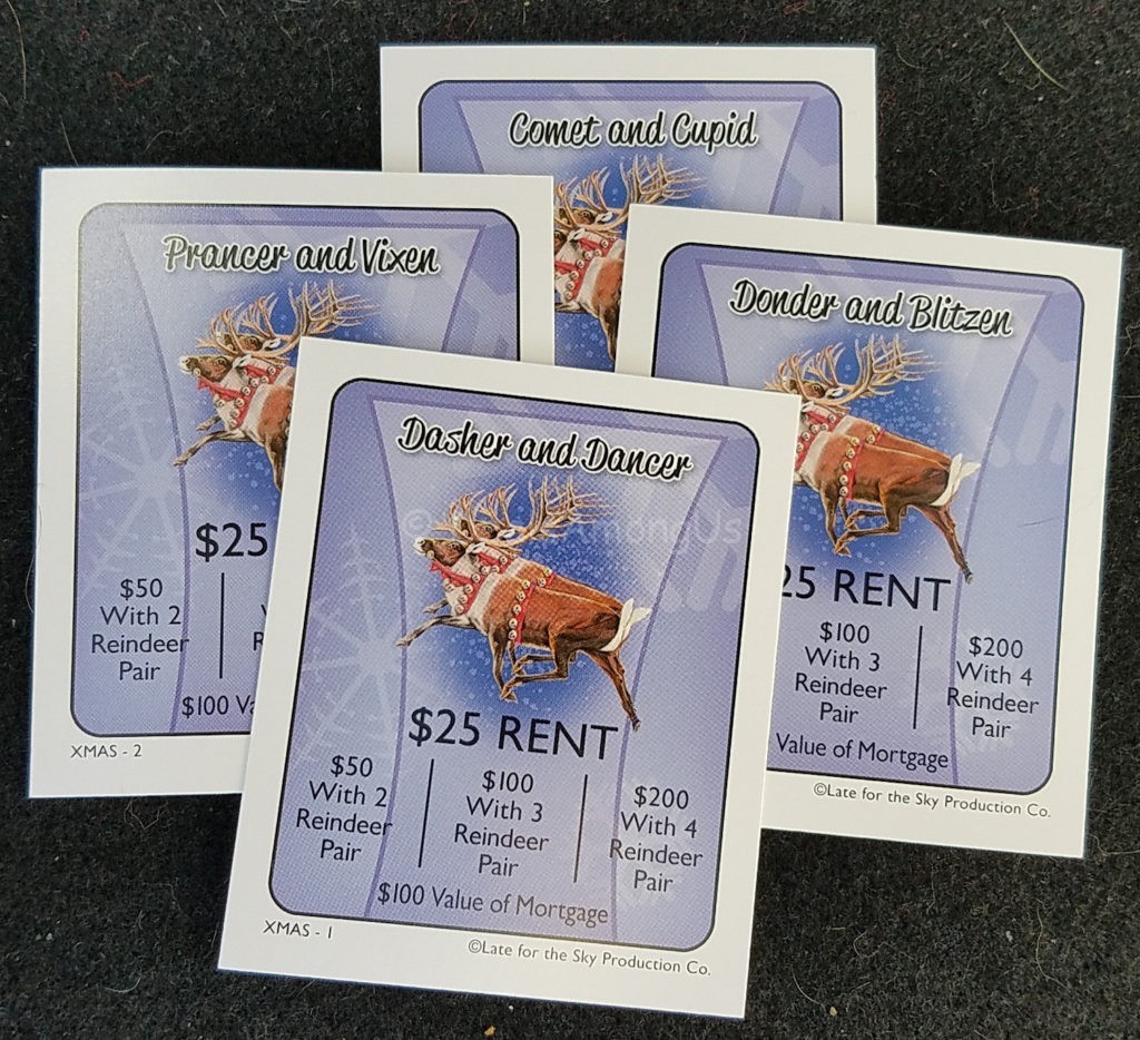 Instead of the typical railroads, it is replaces with two of Santa’s Reindeer. Each of the four cards that are typically railroads are represented in Comet and Cupid, Prancer and Vixen, Donder and Blitzen, and Dasher and Dancer.