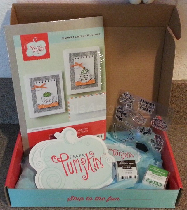 I had the chance to review My Paper Pumpkin’s kit box’s previous months box (click here). I was thrilled to be given the chance to review this months box as well. The theme for July was named “Thanks A Latte”.