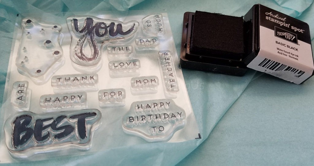 This months stamp set is a mix of 14 stamps that have sentiments, and dots. The words “Best” and “You” are in a more handwriting style which makes a nice variation the more typed words of the other stamps. Also included was one Stampin’ Spot Archival Ink in Basic Black, which is a fast drying and acid free ink.