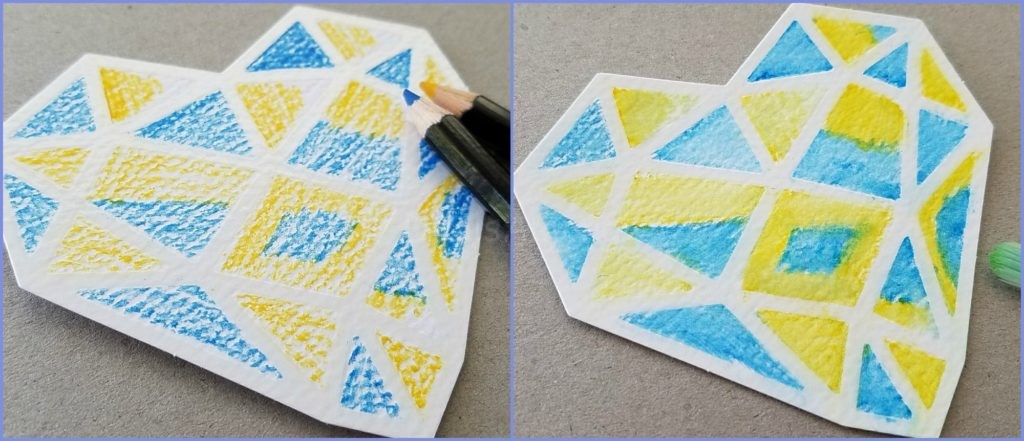 A main component of this kit is the included watercolor pencils, making each card unique and one-of-a-kind. There are resist watercolor paper, which was nice since the resist does not let color bleed into another section. I went with a simple yellow and blue pattern, and in places I colored darker, the watercolor was also darker. I loved the small imperfections on the card, and while it is a little darker in more places, I think that adds to the individuality.
