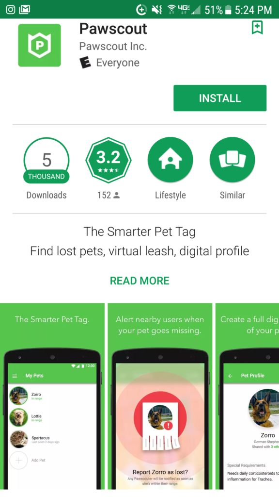 The Pawscout also utilizes an app if your pet goes missing, and all users of the app will be alerted that your pet is missing and to call the National Guard. If your pet comes within 200 feet (a football field approximately) of anyone with the Pawscout app will be notified, making finding your pet easier and quicker.