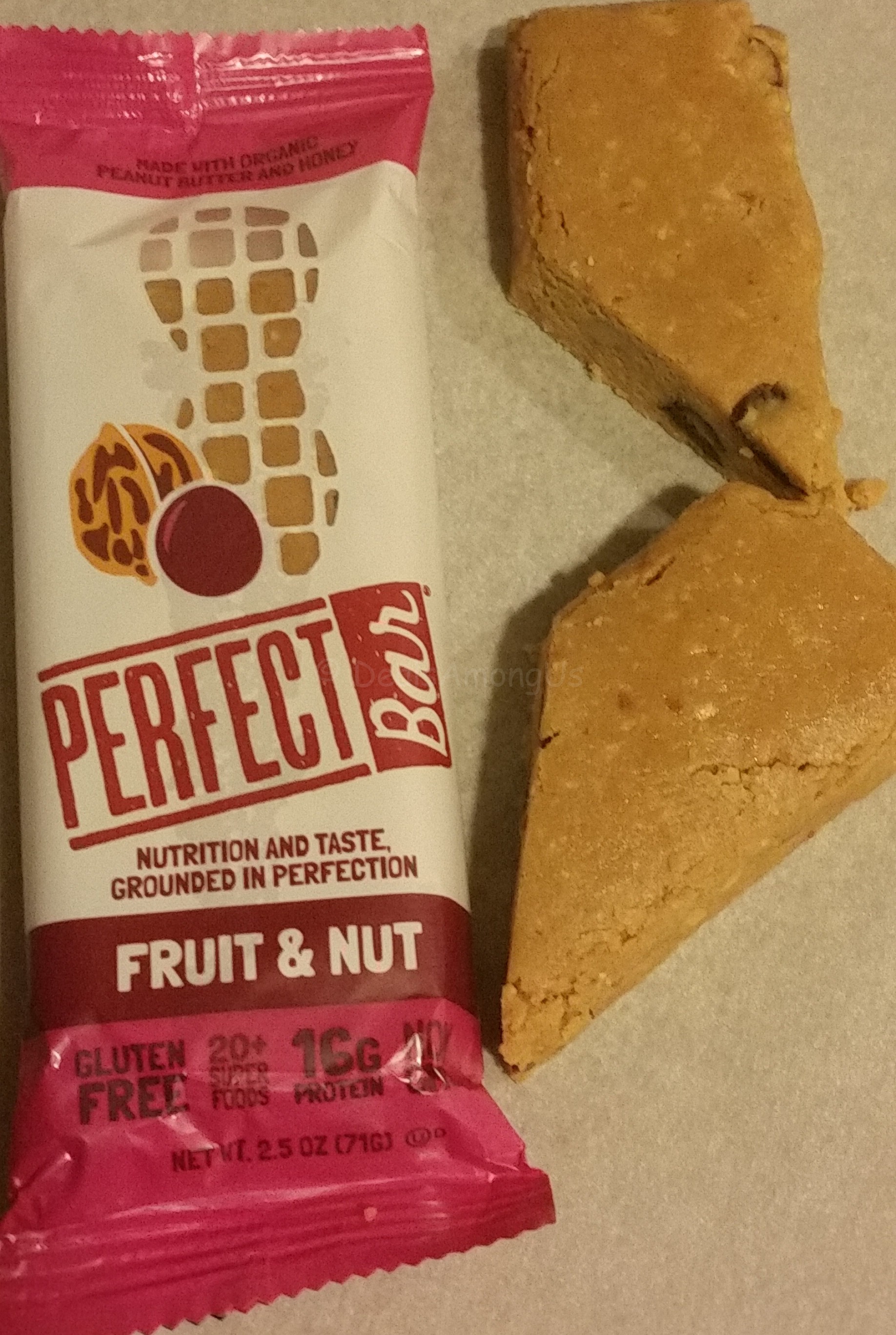 Perfect Bar - Fruit & NutFruit & Nut: This regular size bar has 16g of whole food protein and uses 82% organic ingredients. This bar is organic peanut butter, organic honey, raisins, walnuts and a 20+ super food mixture that includes organic apple, organic pumpkin seeds and organic rose hip to name a few. I tasted the fruits and nuts prominently and this was flavorful.