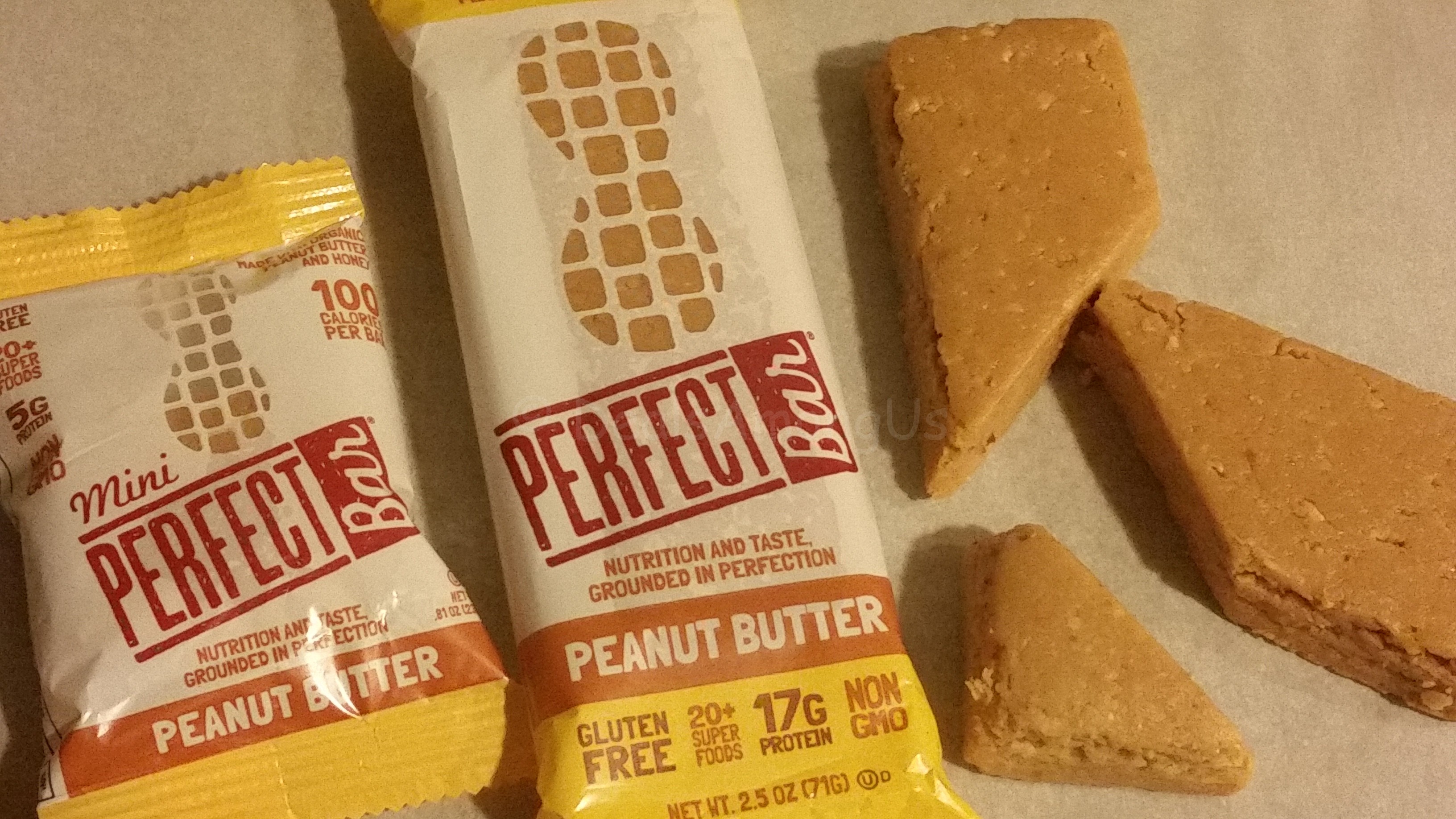 Perfect Bar - Peanut ButterPeanut Butter Bar and Mini Peanut Butter Bar: The regular size bar has 17g of whole food protein, and the mini has 5g of whole food protein. The regular bar contains 84% organic ingredients and the mini has no refined sugar and is soy free. The best way I can describe the taste of this bar was imagine compacted peanut butter in a bar. The bar had a mild sweetness to it, and honestly I am a peanut butter lover so i thought this bar hit the right taste buds. I will say that the big bar seemed to be a lot of peanut butter but the mini was the perfect amount.