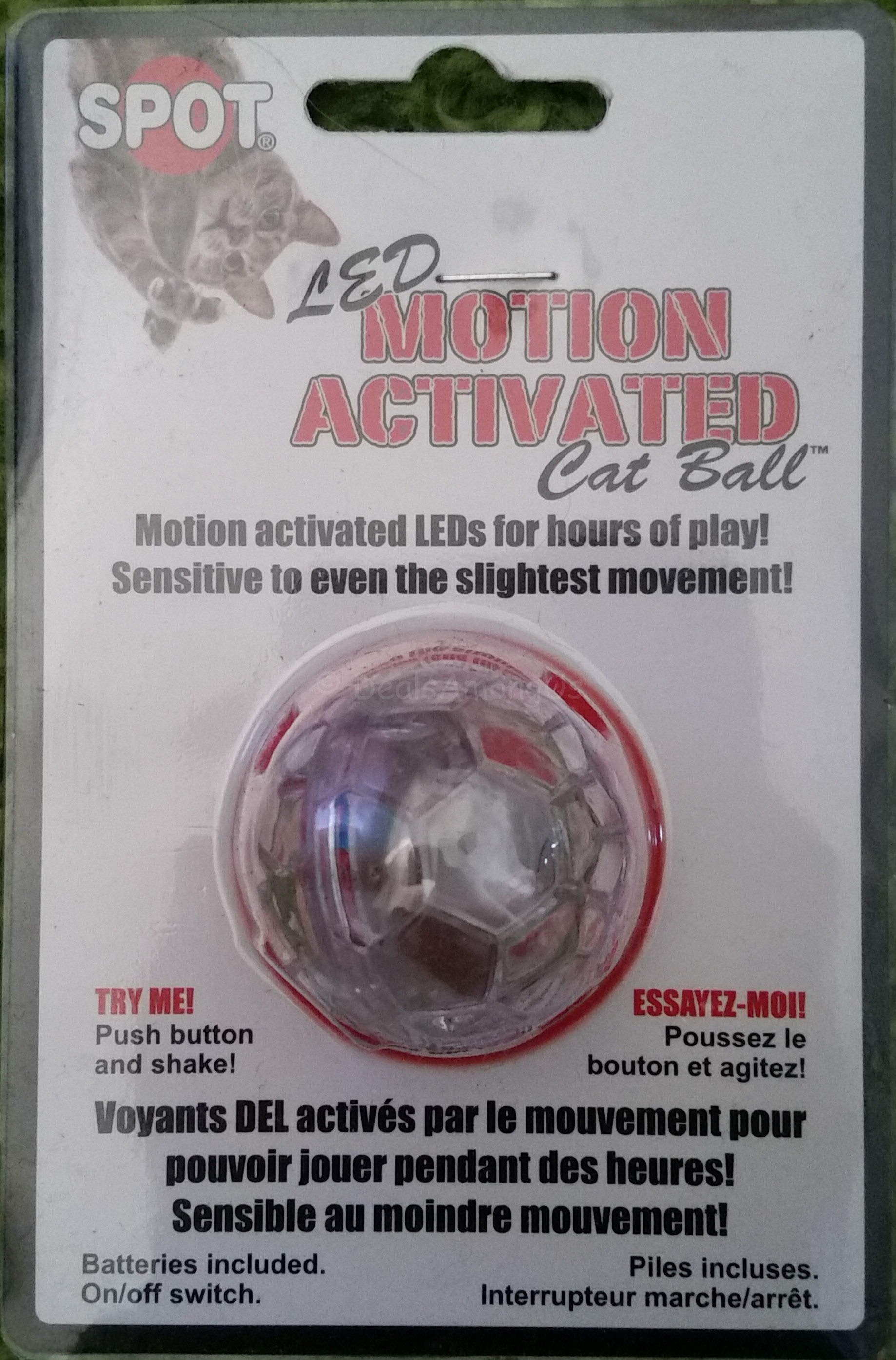 Spot LED Motion Activated Cat Ball – $ 4.44: This ball is constant color and constant motion for the cat. The ball is about 2″ in circumference and has a button on the side that activates the color, which is really get the animals attention. The Muggles seemed very interested in the colors but did not bat the ball around as much as I thought that they would.