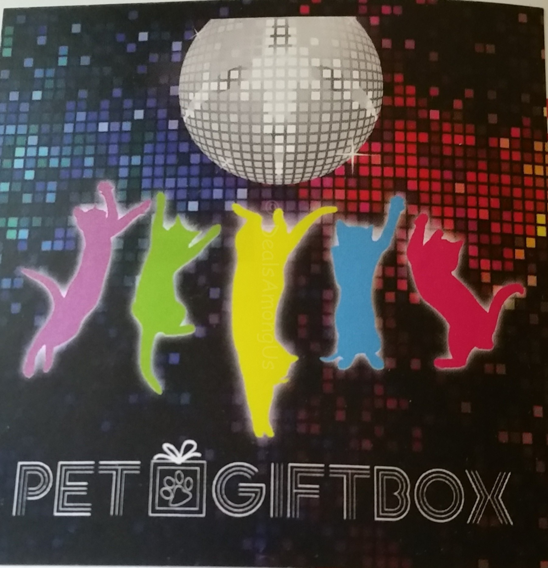The disco craze was not limited to the music that was played but also the clothes worn, the plans for the weekend and your dance ability. There is no movie from the 1970’s that personifies the 70’s as “Saturday Night Fever“. This movie from 1977 tells the story of a man who spends his weekends at the local discotheque. This movie features the songs of the Bee Gee’s and made Stayin’ Alive what it is today. Given the cultural impact that this movie has had on society it seems appropriate that this months Pet Gift Box theme is “Caturday Night Fever”. The treats included in this months box had a disco and 1970;s theme and included the following: