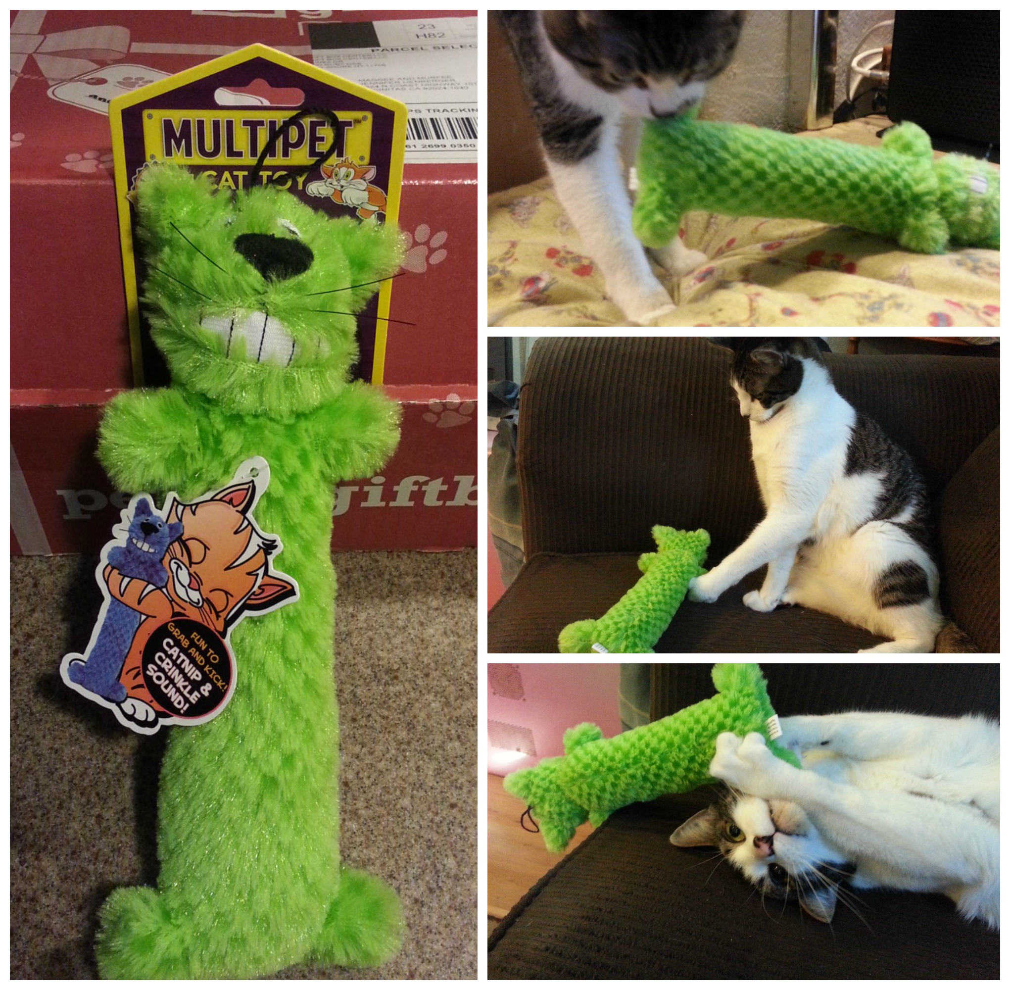 Multipet Cat Loofa – $3.99 (per PGB): A 10″ elongated catnip crinkle toy. This reminded me of a green big toothed monster. The entire middle crinkles and makes the cats think they are killing something. The toy is infused with catnip which makes the cat constantly want to hunt and play. I am happy to say that both cats loved and continue to play with it.