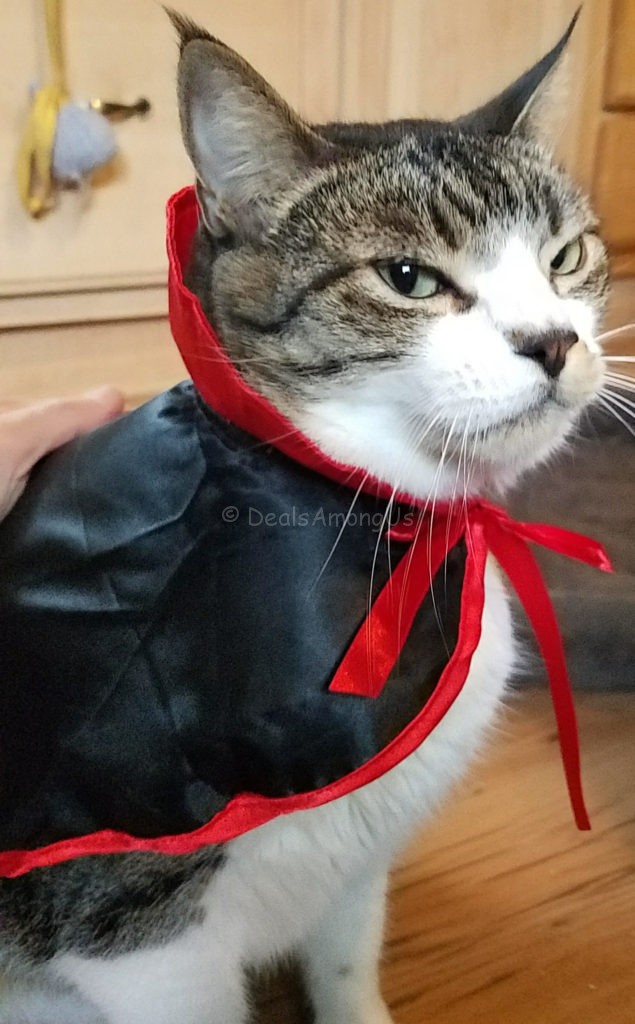 Cat Halloween Costume – Red Vampire Cape: I loved this cape from the moment that i saw it! I first gave it to Murfee, but all he did was grab it and put it in his mouth and play. Maggee on the other hand wore it and gave me a look of death! All kidding aside, this fit her perfect and has been added to her rotating collection of outfits to wear.