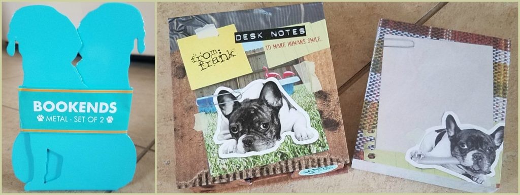 Treats for Human and Dog: Each month Pet Treater includes a present for the guardian of the animal. This month were Dog Shaped Bookends and From Frank: Desk Notes, which is a super cute set of paper for notes, and dog shaped bookends.