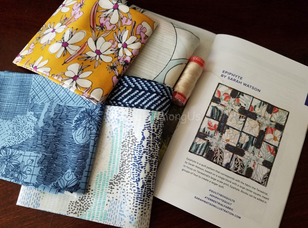 Terrestrial Fabric Bundle: Inspired by the rain forests of Brazil, this is full of bright colors, and vibrant prints that includes flowers and intricate designs. Also included was a spool of Aurifil Thread in color 2312.