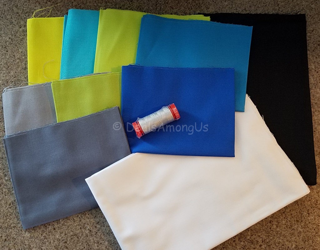 Kona Solids Fabric Bundle: This collection of fabric is a selection from the Kona Solids Line and includes 2 greys, 3 blues, and 3 yellow/greens. Also included is black and white fabric. Also included is a Auriful Thread (#2600) which is a pale blue that almost looks like a clear sky, it coordinates with this fabric well.