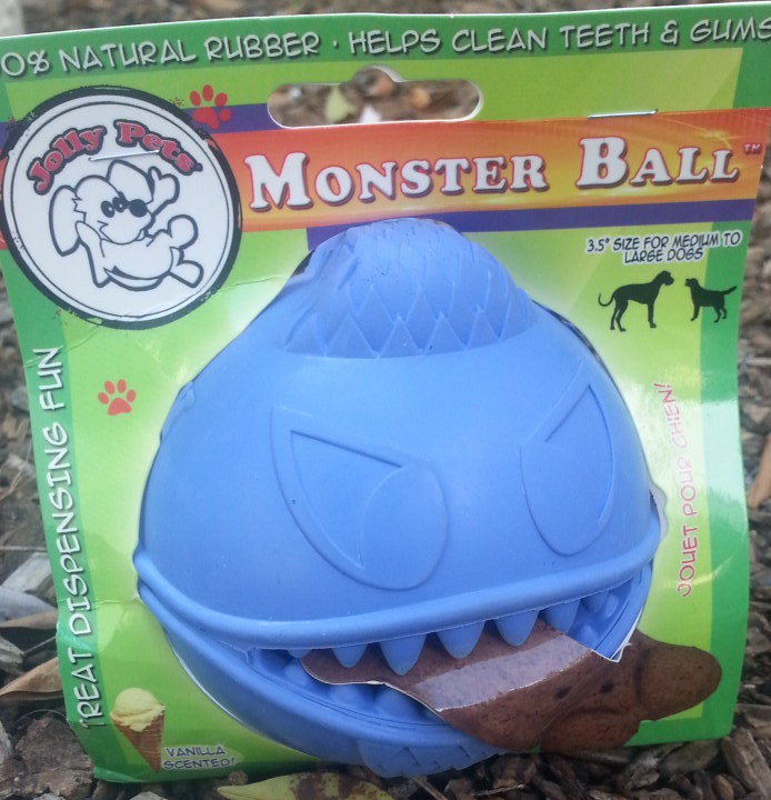 Monster Ball Dog Toy: This was a 3.5″ in diameter blue non-toxic rubber vanilla scented ball with a “mouth” to stash treats. We stuffed a couple of pieces of party pepperoni and let the dog attempt to retrieve the treats. This is a thick rubber and should hold up to many throws and returns with your dog. This is available for $4.19-$5.39