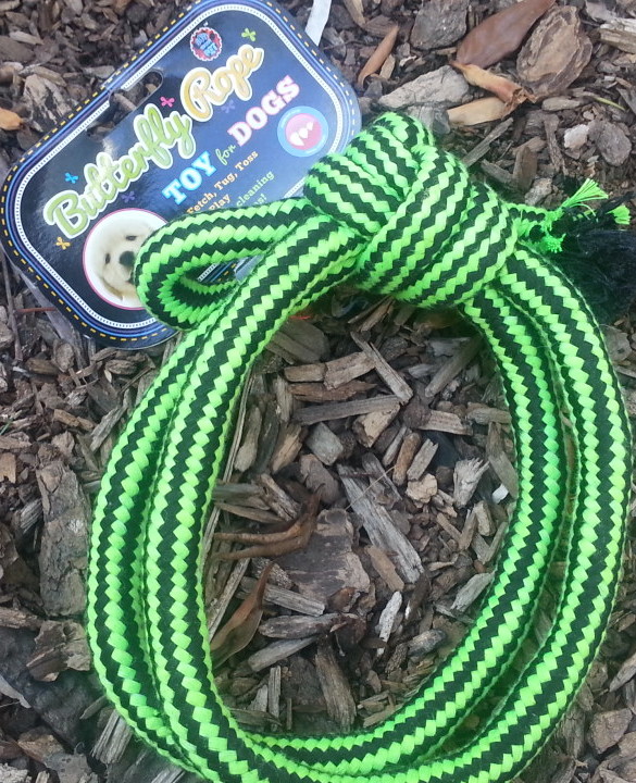 Butterfly Rope: This is a totally cute toy that allows for a fun human vs. dog tug of war game. The one that we received was a neon green and black. The other awesome application is if you have 2 dogs, they can play their own game of tug o’ war. This seems to be a strong durable braid that will hold up to lots of tugs. Toys that are similar retail for approximately $6.00 to $8.00