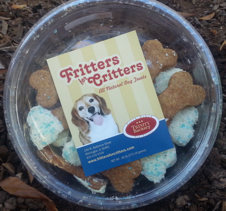 Fritters for Critters: These came in a round plastic tub with a top that sealed the cookies inside for freshness. The treats we received were bone shaped with end of the cookie dipped in white icing that was then covered in blue sprinkles. The dogs were apprehensive at first to the cookie, but quickly came around to liking them. These retail anywhere from $3.59-$4.19