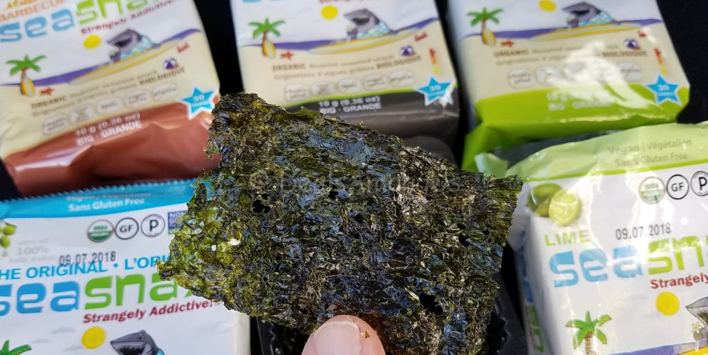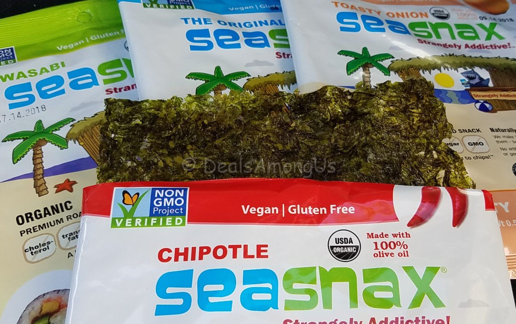 SeaSnax Sheets in Original/Organic, Toasty Onion, Wasabi and Chipolte – These are packages of 5 full sheets of roasted seaweed. These are also Non-GMO Project Verified and are vegan, gluten-free and contain only three all natural ingredients. They contain no artificial colors, flavors or preservatives and high in vitamins (B1, B6, C), vegetable protein, fiber, iron and other minerals.