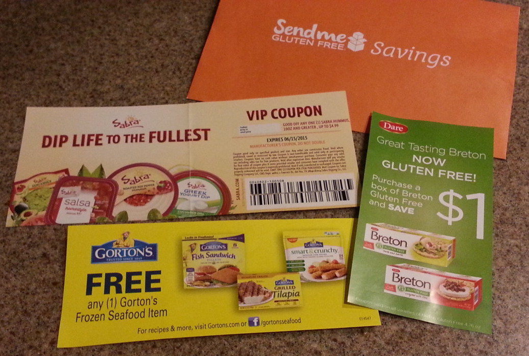 Also, included were three of coupons which included 2 free item coupons. There were coupons for a free Gorton’s Seafood item and a free Sabra product. Also included was a $1.00 off coupon code for Breton Crackers.