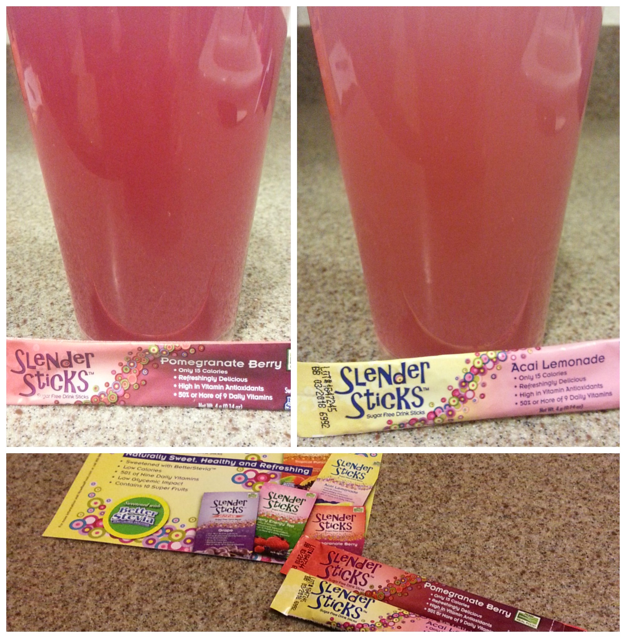Slender Sticks – Acai Lemonade and Pomegranate Berry – These are powder packets that can be added to a 16oz bottle of water, shaken and then easily drank. Slender Sticks are sweetened with Better Stevia and seemed to be not as sweet as in other Stevia sweetened drinks. Containing 10 super fruits, and 50% of 9 daily vitamins, this is a good alternative to plain water.