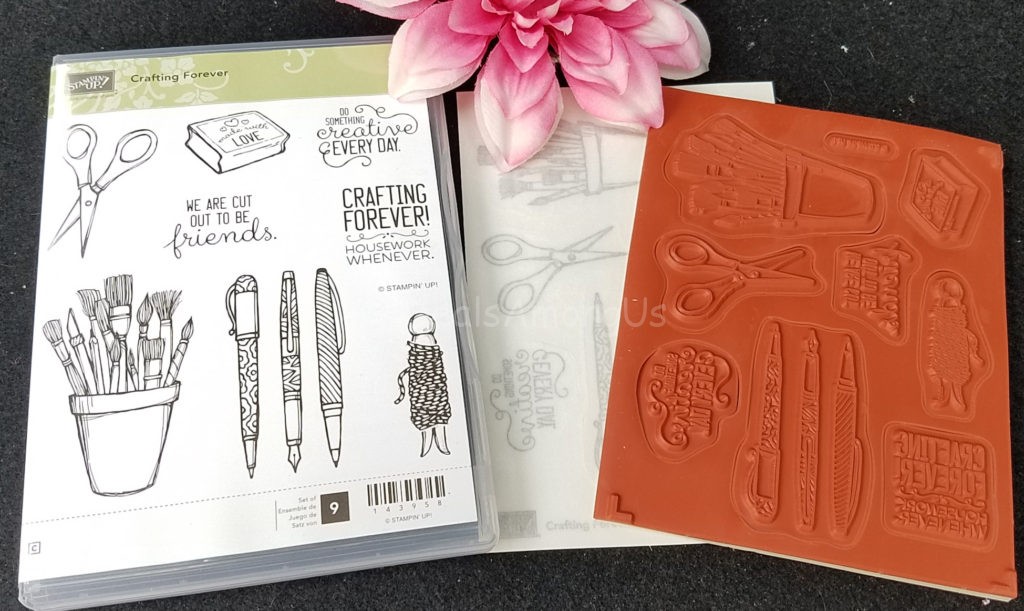 I received the crafting themed Crafting Forever Rubber Stamp Set by Stampin’ Up for review. This 9 stamp collection is available as a rubber-mount collection as well as a clear-mount stamp set.