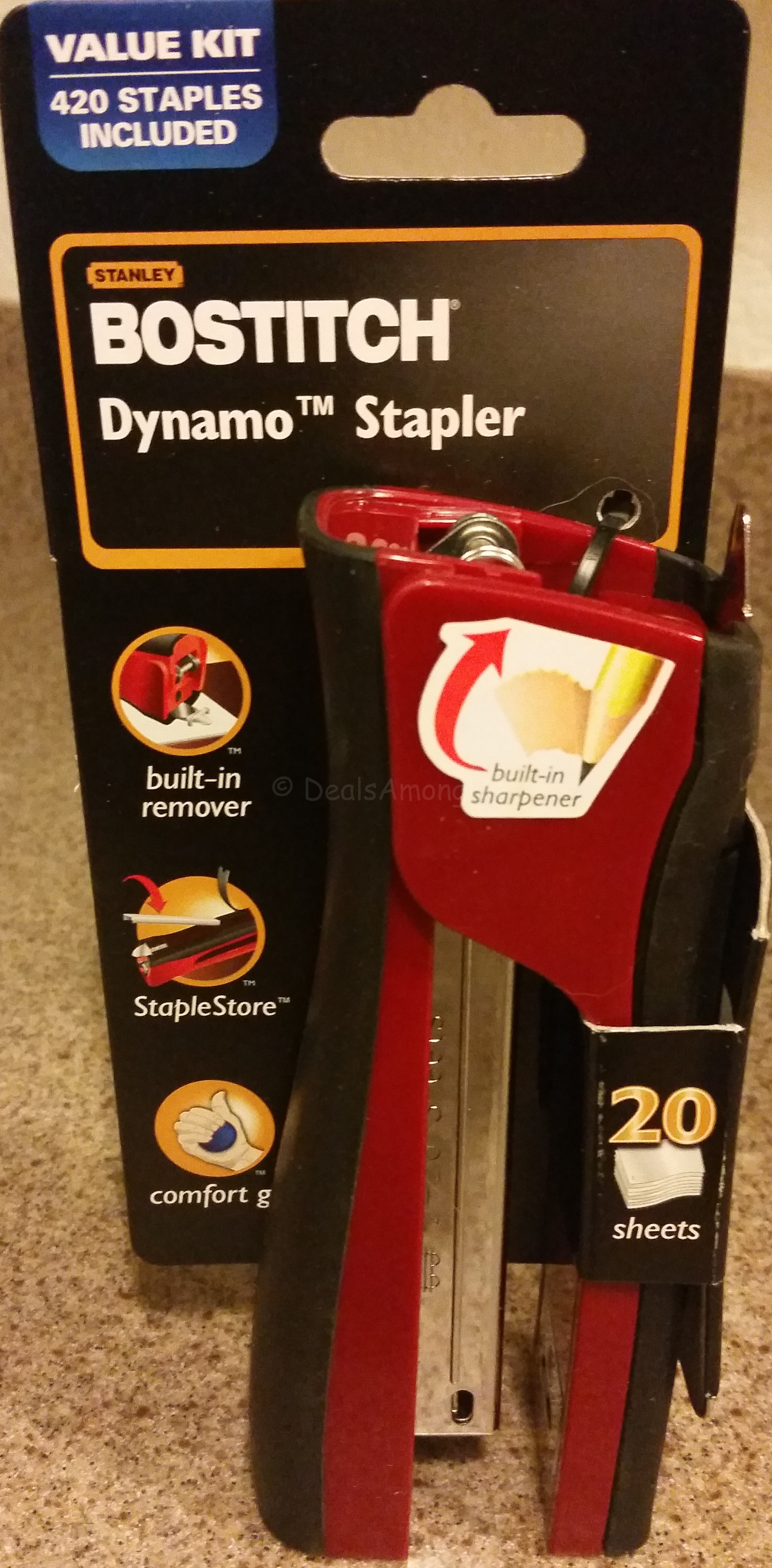 When I received the Stanley Bostitch Dynamo Stapler in the mail the first thing I noticed was the color – RED! The second thing that immediately got my attention was the features included in such a compact stapler, which included: