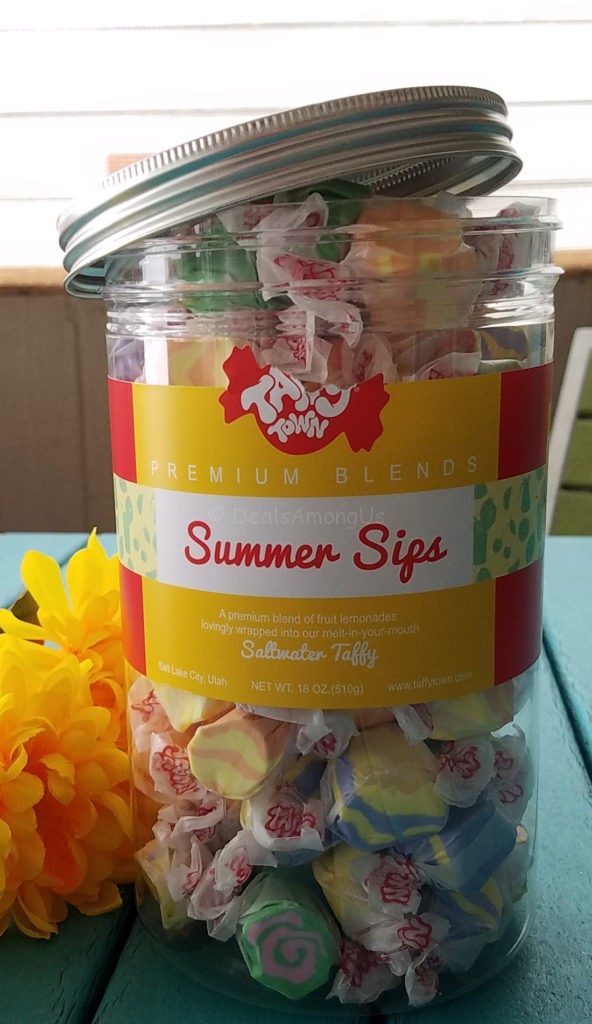 Choose from Taffy Town’s Gift Jar selections including Bakery Bites, Summer Sips, Harvest Treats, Peppermint Stick, Egg Nog, Holiday Favorites, Stars and Stripes, Licorice Lovers, Theater Treats, Spring Flings, Fruit Salad, Melon Mix, Orchard Picks, Berries & Creme, and Tropical Fruit. The taffy comes in a resealable jar, that makes storage while keeping the taffy accessible.