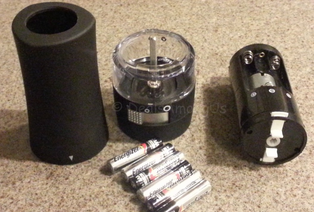 The grinder is a bit difficult to unscrew. The reason that you need to unscrew it is for the loading of the 6 AAA batteries and the pepper kernels. This is a twist system that can be a bit difficult to loosen and I did worry I would push it to far and snap it – my advice is to be careful and do not go past the lock icons on the grinder. I was taken aback by the use of 6 batteries and worried about the weight. I was pleased that this did not add any additional weight or make the grinder feel awkward.