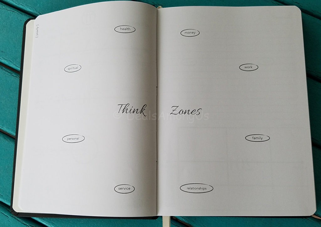 The Think Time journal planners include the following in each planner: 1 yearly calendar, 12 months, each of the 52 weeks. Also included is free space, as well as journal space and note space, with some additional extras in the back of the planner.