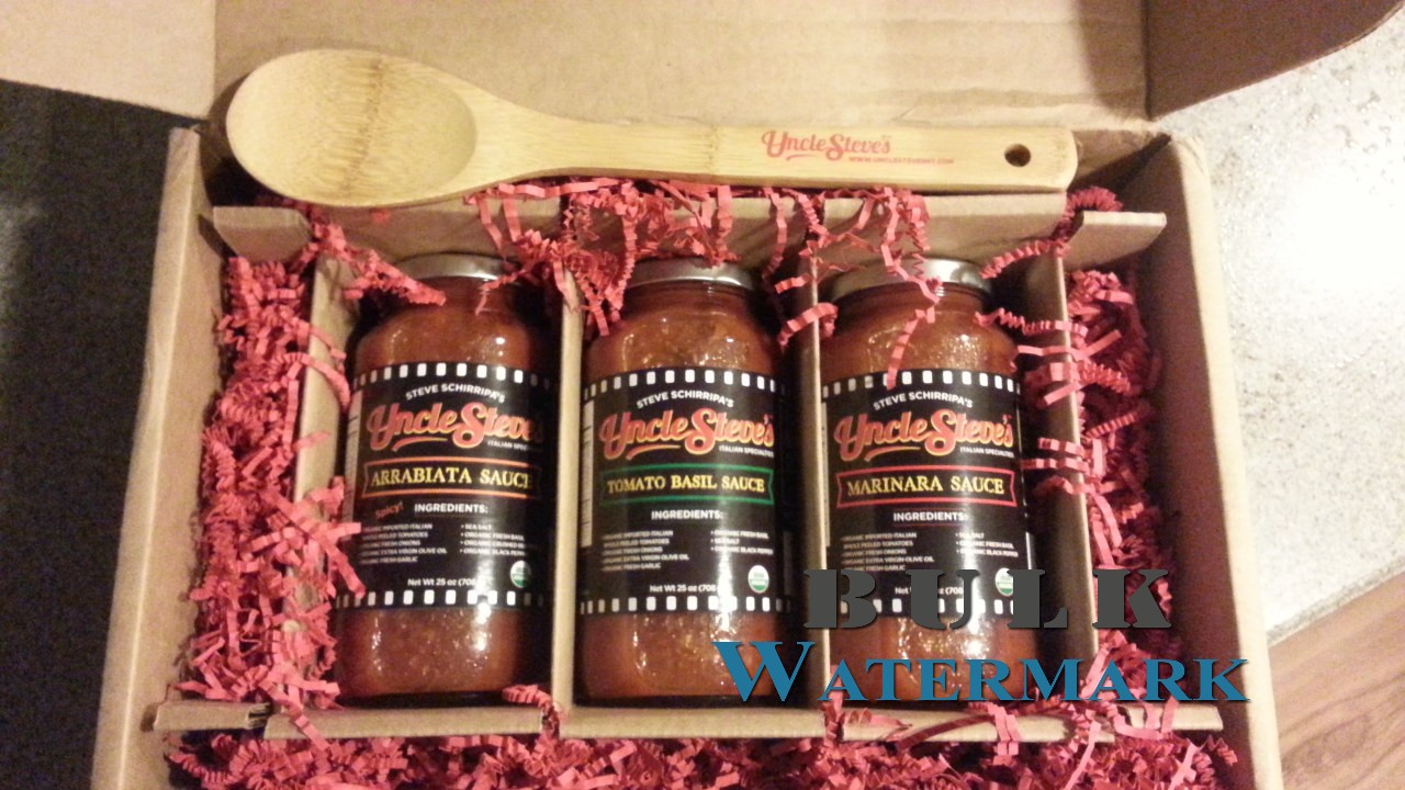 In my quest to locate the perfect sauce I reached out to Uncle Steve’s Italian Specialties for a sample of their sauces. They were kind enough to send me 1 jar of each of their Tomato Basil Sauce, Marinara Sauce, Spicy Arrabiata Sauce. Also, included was a branded wooden spoon which I found very neat because I had been wanting a nice quality wooden spoon.