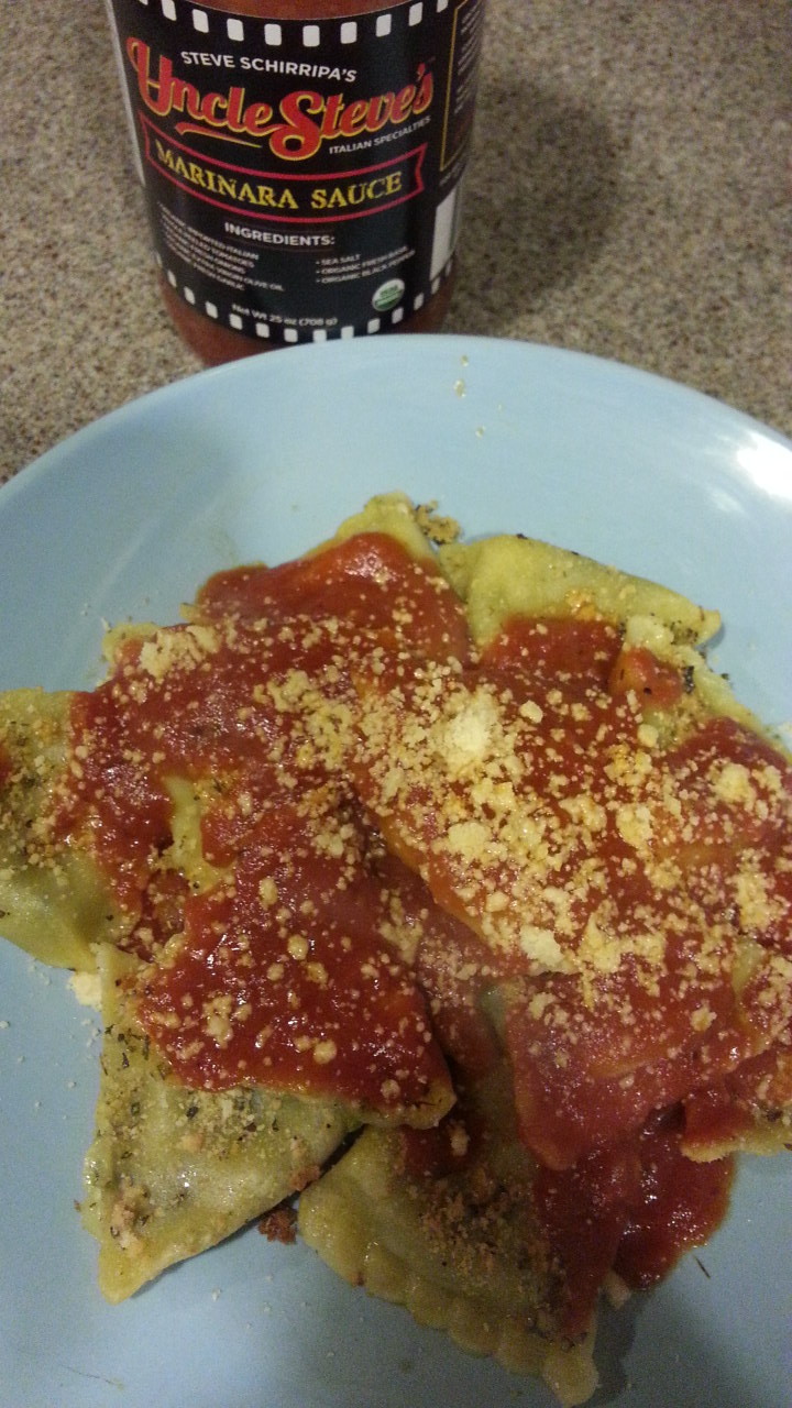 20150404_022448The second sauce we used, we made ravioli and we used the Marinara Sauce. As a non-italian the only marinara sauce I have had been the kind with the rip off top or on the side that comes from a large jar. Jason discovered these cheese and spinach filled pasta squares and they were the perfect base for the chosen sauce. Just like the Tomato Basil the tomatos were chunky and the sauce was not watery. The smell was fresh and the taste was equally fresh.