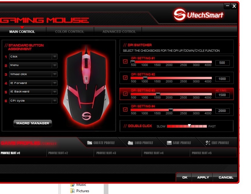 The UtechSmart Mar’s Gaming Mouse features 4000 DPI with a polling rate of 1000, with on the fly DPI profiles for quick changes. The mouse changes color with each DPI rate, the colors are bright and are purple, red, blue and green each with a bright light lighting them up. The mouse has 5 on board stored profiles as well as changing colors for each custom DPI settings.